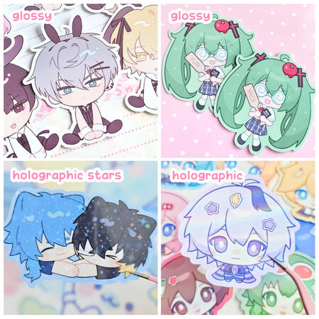 Custom vinyl stickers with glossy or holographic laminate.
